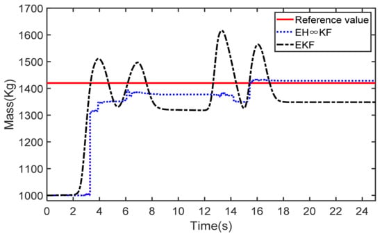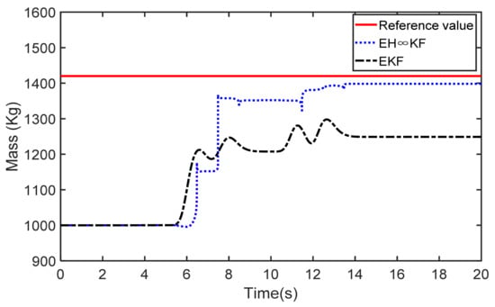 Figure 14 demonstrates the estimation results of vehicle mass based separately on EKF and EH∞KF methods. As described in Figure 14, the vehicle mass estimation curve of the EKF algorithm rises rapidly after 2 s. After about 18 s, the vehicle mass estimation based on the EKF algorithm converges to 1350 kg. It is obvious that there is a difference of 70 kg from the reference value. For the EH∞KF algorithm, the vehicle mass estimation curve rises rapidly after 3.5 s. The vehicle mass estimation converges quickly to 1380 kg after 6 s. At the moment of 14 s, the vehicle mass estimation curve of the EH∞KF fluctuates again. The vehicle mass estimation converges quickly to 1422 kg at the moment of 16 s. The EH∞KF method is closer to the reference value than the EKF method under the above conditions.