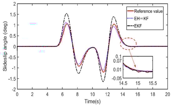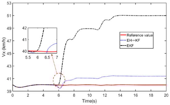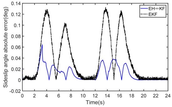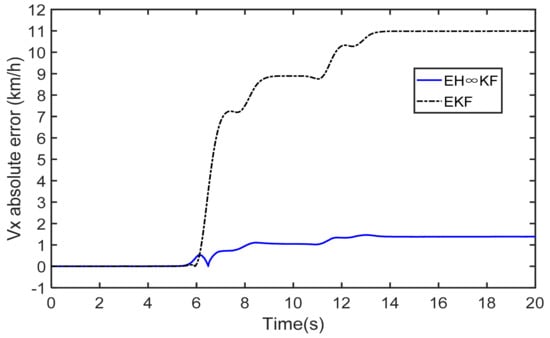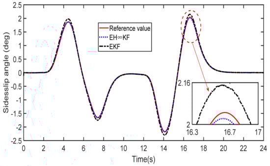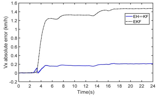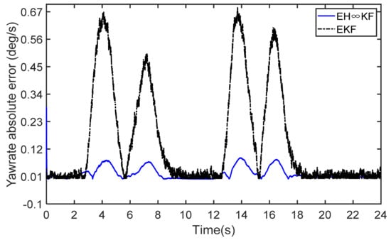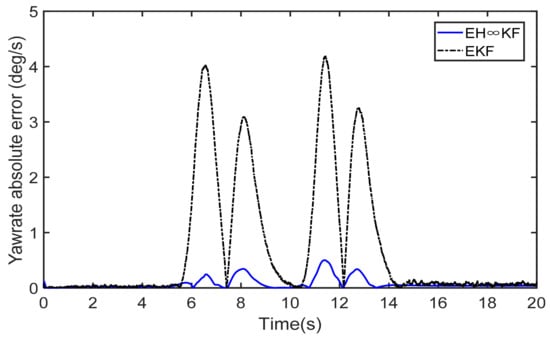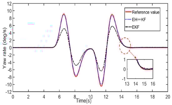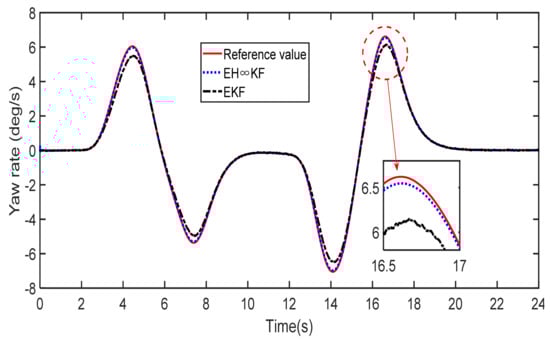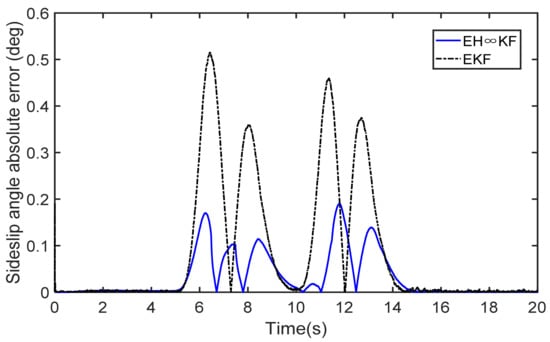 Figure 7, Figure 8 and Figure 9 show the estimation results of yaw rate, sideslip angle, and vehicle speed using the EKF and the EH∞KF on high friction coefficient road. According to the figures, it can be noticed that the yaw rate, sideslip angle, and vehicle speed estimation curves of the EH∞KF follow reference values better during the simulation process. Nevertheless, the estimation curves of the EKF are far from the reference value. From the locally enlarged view in Figure 7 and Figure 8, it can be seen that the effect of EH∞KF is better than EKF. In Figure 9, the vehicle speed estimation using the EKF has a large fluctuation at the moment of the 6 s, and a huge estimation deviation with a reference value from the 6 s to the 20 s. From Figure 10, Figure 11 and Figure 12, we can see that the mean absolute error of vehicle state estimation using the EH∞KF is lower than the EKF. The RMSE index of the vehicle state is shown in Table 2. The EH∞KF consistently outperforms the EKF. In summary, the estimation performance of the EH∞KF is better than standard EKF under the above conditions.