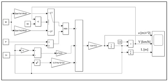 On the basis of the vehicle dynamics model (Equations (1)–(13)), a simulation model was developed in the MATLAB/Simulink environment. The structure of the model is presented in Figure 3. It allows estimation of instantaneous vehicle acceleration when the traction force is determined by means of acceleration pedal position. Therefore, this model was used only to validate the vehicle dynamic model. Then, based on the same equations, a second numerical model was developed in the Matlab/Simulink environment, which allows estimation the vehicle power demand and energy consumption of driving on a test cycle [29,30,31]. However, in the second model, the vehicle instantaneous speed was an input parameter, determined by the cycle.
