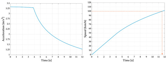 In order to validate our simulation model, an estimation of time for acceleration from 0 to 100 km/h was carried out. In this study, maximum traction force was applied to the wheels, limited by the motor rated torque, motor rated power and tire slip. It was considered an acceleration on a dry tarmac with friction coefficient and the front axle vertical force of 50% of the total vertical force. The results concerning instantaneous acceleration vs. time and speed vs. time are presented in Figure 4.