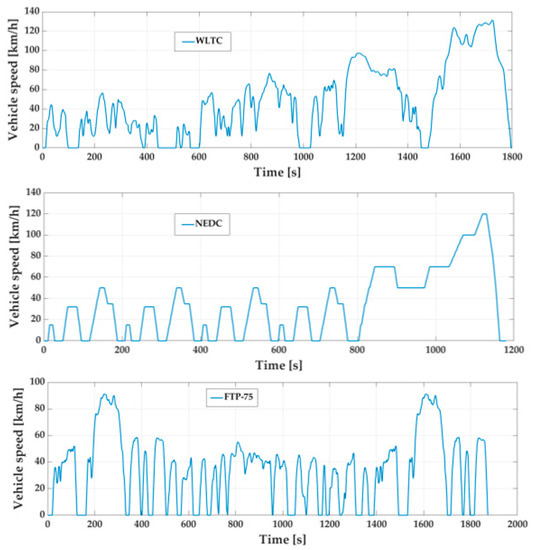 Multiple examinations of the behavior of the different types of EVs were realized using several test procedures provided by Working Party on Pollution and Energy (GRPE). We studied the driving energy demand for the vehicle over WLTC, NEDC and FTP test cycles. These cycles are used for emissions testing as well as to test fuel consumption in homologation procedures. However, they represent the real vehicle behavior, taking into consideration urban, rural and highway driving conditions. Due to this, they could be used for the evaluation of energy demand as well as to estimate the autonomy of EVs. We aimed to assess the different driving dynamics of each cycle according to the specific energy consumption of an electric vehicle. WLTC is a part of the actual homologation procedure in the EU, as it replaced the NEDC in 2017. WLTC has three modifications, depending on the vehicle power to mass ratio. In this study, the WLTC representing Class 3 vehicles was used. The FTP-75 test procedure is adopted in the US. The main parameters of the cycles are listed in Table 2.