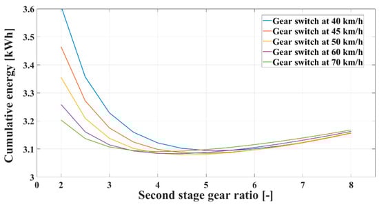 The second gear ratio could vary over a wide range. The first restriction that needs to be taken into account is the maximum vehicle speed, estimated based on motor nominal electric power and maximum motor speed. For the studied vehicle, with the parameters defined in Table 3, the theoretical maximum speed was estimated to be 205 km/h. In order to achieve this speed at maximum motor rotational speed (10,000 rpm), a gear ratio of 5.79 was used. However, the motor offers constant output power within the range of 3000 to 10,000 rpm. Thus, any gear ratio within the range of 1.74 to 5.79 can provide the maximum speed of 205 km/h. Moreover, if the maximum speed is reduced bellow 205 km/h, a gear ratio up to 8 can be used. In our case, we carried out the simulation of electrical energy consumption when the second gear ratio varied within the range of 2 to 8 for gear switching speed from 40 to 70 km/h. The simulation was conducted over WLTC. The results are presented in Figure 6.