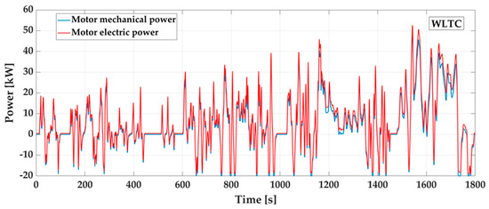 Motor electric and mechanical power vs. time for WLTC in the case of a single speed gearbox.