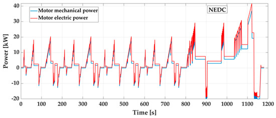 Motor electric and mechanical power vs. time for NEDC in the case of a single speed gearbox.