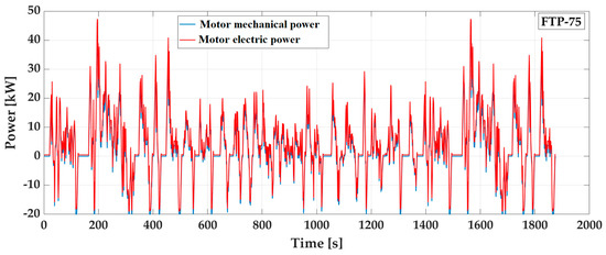Motor electric and mechanical power vs. time for FTP-75 in the case of a single speed gearbox.