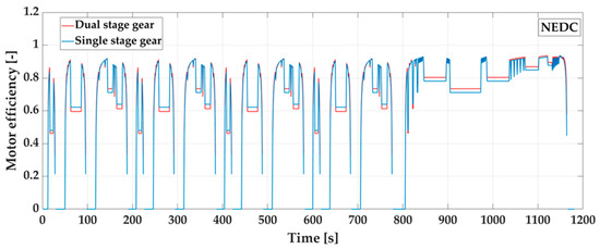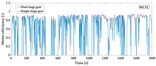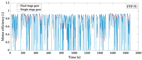 Different gear ratios lead to variation in the motor operating points, and thus variation in the motor efficiency occurs. An evaluation of the motor efficiency in the case of single and double speed gearboxes over the test cycles WLTC, NEDC and FTP-75 is presented in Figure 10, Figure 11 and Figure 12.