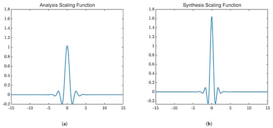 Scaling and wavelet functions. (a) analysis scaling function; (b) synthesis scaling function; (c) analysis wavelet function; (d) synthesis wavelet function.