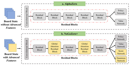 However, the large amount of computational resources consumed by the training process of AlphaZero and the relatively immature network structures encouraged many researchers to look into improved methods based on AlphaZero. An open-source project called ELF OpenGo [4] reached superhuman level in the game of Go after two weeks of training on 2000 GPUs (a relatively small number compared with the 5000 TPUs used by AlphaZero). KataGo [9], a reimplementation of AlphaGo Zero, improved the learning process in many ways, including using different optimization approaches to have more data about the value in a shorter period of time and using additional training targets to speed up the training process. Leela Zero [10], which is an open-source program trained with GPUs donated by a community of contributors, mastered Go and chess. Morandin et al. [11] proposed a sensible artificial intelligence (SAI) that plays Go to overcome the problem that AIs cannot target their margin of victory, and this is the common problem shared by most of the famous early-game AIs based on AlphaZero. Thus, the SAI successfully overcame the negative consequences: AIs often win by a small margin, cannot be used with komi 6.5, and show lousy play in handicap games.