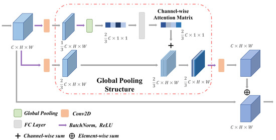 Previous studies showed that avoiding dimensionality reduction in the FC layer is crucial for learning channel attention [18]. Therefore, we set the value of to twice that of to avoid performance degradation caused by dimensional changes. GPS was inserted into a standard residual block and eventually constituted GARB. Given input of GARB, two independent convolutional layers decomposed the input into X with channel dimension number , and G with channel dimension number before sending it to GPS.