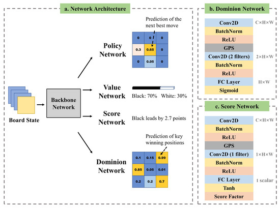Our proposed score-head architecture is shown in Figure 4c. The network structure of the score head is similar to that of the dominion head, with two differences. The first is that the convolutional layer of the global pooling convolutional block has only one filter, so the output feature map is 1 in the channel dimension. The second is that the output layer of the score head contains a FC layer with tanh activation, outputting a scalar in the range of [−1, 1]. Lastly, we multiply it by the score factor to reflect the score gap between the two players. In NoGo, since most score gaps are within 5 points, the score factor was set to 5, and a larger score gap is regarded as 5 points once appearing. Therefore, output ys is a scalar in the range of [−5, 5].