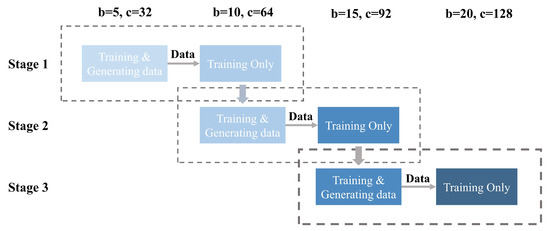 Process of network curriculum learning. Data generated by the shallower network are used to train both the shallow network itself and a deeper network. The whole process contains three stages, and the network with b = 20, c = 128 was extracted as the final network that is used in the agent.