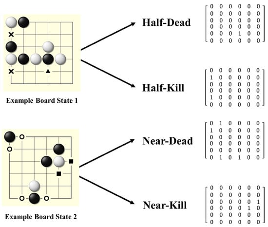 The four above features are (1) ‘half-dead’, (2) ‘near-dead’, (3) ‘half-kill’, and (4) ‘near-kill’, respectively. One-hot encoding is used to represent the four advanced features. The corresponding location in the input layer is set to 1 once a specific feature appears. The corresponding features are schematically shown in Figure 6.