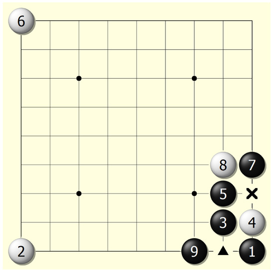 Demonstration of ‘triangle strategy’. Black successfully built a triangle structure in the location marked by Δ, and white successfully prevented black from building triangle structure in Step 4 because neither black nor white could occupy the location marked by ×. Moreover, the white stone placed in Step 8 also tried to destroy a potential triangle structure that may have contained the black stones placed in Steps 5 and 7.