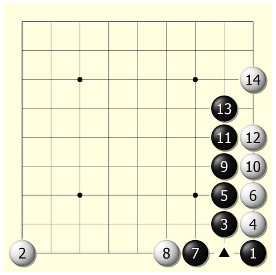 A typical situation where the white falls behind. Starting from Step 4, white tried hard to prevent black from using the triangle strategy, but black always took the lead. Although white made a wise choice in Step 14 and terminated the ‘chasing game’, black successfully built a triangle structure in Step 7. The whole process indicates that black has an obvious advantage over white when the NoGoZero+ agent is well-trained.