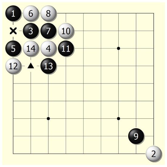 Demonstration of predictive strategy. When black tried to build a triangle structure in Step 3, instead of chasing black’s step like the behavior shown in Figure 8, white took Step 4 and built a wider encirclement, thus rendering the triangle structure built by black (marked by ×) useless.