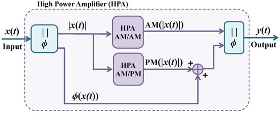 where and are, respectively, the AM/AM and AM/PM distortion functions. According to Saleh’s model [26], the AM/AM and AM/PM conversions can be written as