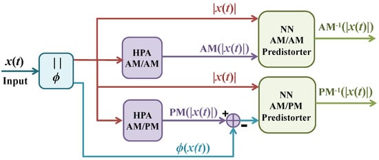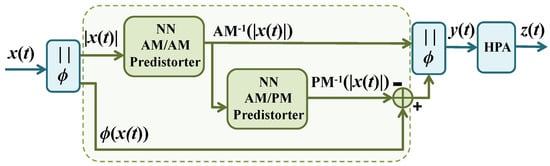 Following off-line training, both NN models are used before the high-power amplifier, as shown in Figure 4. We would like to highlight that the examples of amplifiers used in this paper are only meant to obtain results and validate the performance of the proposed pre-distorter scheme. Once trained with the specific amplifier response, the NN models are able to pre-distort the input signal adequately.