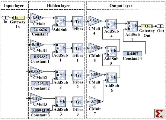 Figure 6 and Figure 7 represent the architecture of a neural networks, of the AM/AM pre-distorter for TWTA and SSPA, respectively, implemented using Xilinx system generator [34]. To achieve the proposed implementations signed fixed-point representation has been adopted, allowing a better computational speed and minimal resources consumption at expenses of a reduced degradation. The number of bits has been optimized to obtain the best trade-off between speed, space and degradation. Each sample is encoded on 16 bits: 5 bits are reserved for the integer part, 10 bits for the fractional part and one bit of sign. It should be noted that the number of bits at the transmitter side is not usually a problem and it is fixed to the maximum number of bits at Digital to Analog Converter (DAC) to maximize the dynamic range of the transmitted signal. It is worth noting that for AM/PM pre-distorter, the same NN architecture implementation is adopted, the difference is that the weights and bias take a different values, for TWTA and SSPA, respectively. It should be noted that complex multipliers are needed to operate in the output layer, which corresponds to a four real-valued multipliers pipe-line architecture in the implementation as a trade-off between complexity, efficiency and resources.