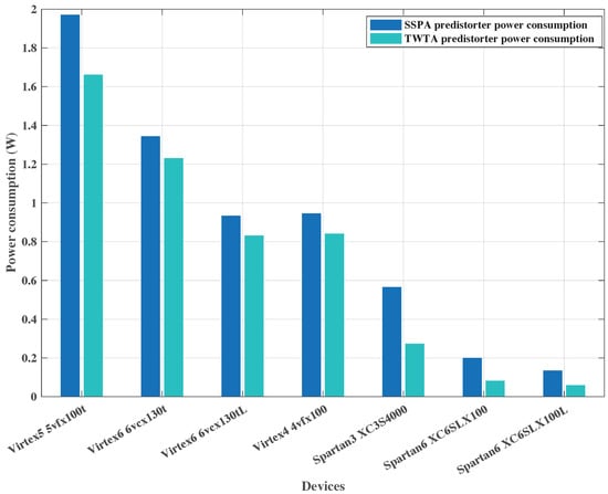 Table 2 and Figure 11 show the power consumption for TWTA and SSPA pre-distorters. It is worth noting that the TWTA pre-distorter consumes less power than the SSPA pre-distorter. It can also be seen in Figure 11 that the novel FPGA architectures (Spartan) are more efficient than older ones, and our proposal can better exploit the optimization characteristics on these devices. It is especially relevant that in Spartan 6 boards, the power consumption of our proposal could even be neglected, which is a relevant contribution in this context. The power estimation has been obtained with Xilinx Power Analyzer, using Simulation Activity Files (SAIF or VCD) for accurate power analysis, which guarantees enough accuracy on the results.