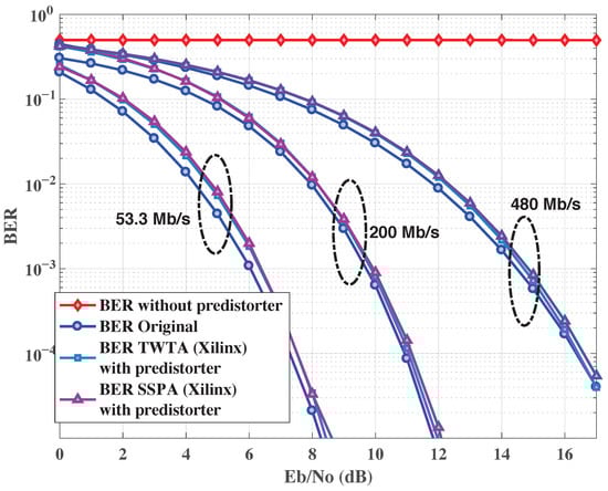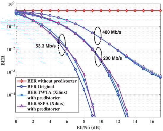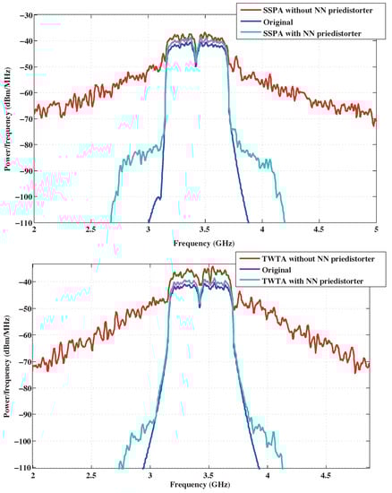 In Figure 18, the power spectral density (PSD) of HPA output signal with and without NN pre-distorters is shown. It can be observed that by using our proposals, the PSD regrowth is negligible. In fact, it is about 5 dB for the TWTA, whereas it is 7 dB for the SSPA, which is very reduced compared to the original signal.
