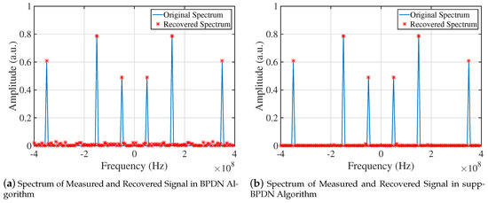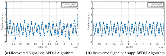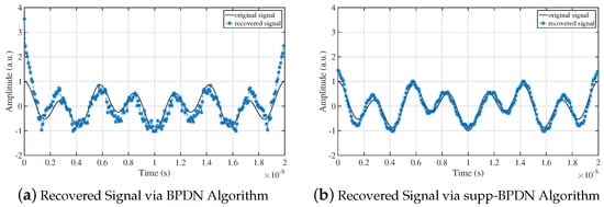 In the next simulation, we changed the frequencies of signal to 1 GHz and 600 MHz, and the sampling rate of ADC was 500 MHz; recovery results are shown in Figure 8. Similarly, supp-BPDN demonstrated better performance at recovering signals.