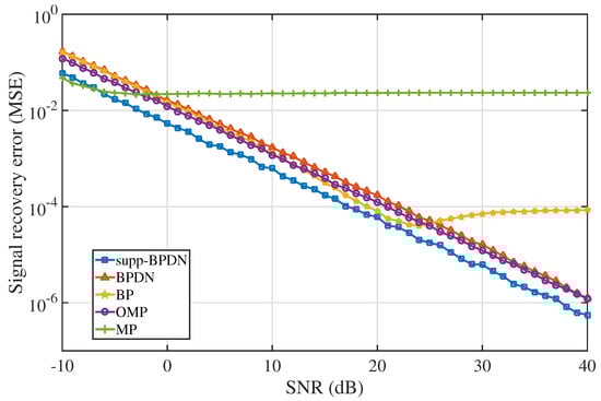 In the simulation, SNR of the system increased from −10 to 40 dB and the step size was 1 dB. Under each variation, the algorithms were executed 100 times; we obtained recovery errors and averaged them. Results are shown in Figure 2; the performance of supp-BPDN was better than those of BPDN and BP algorithms in the entire SNR range. Curves of supp-BPDN and BPDN exhibit the same tendency in general; in the range of −5 to 25 dB, recovery errors of BP are less than those of BPDN, caused by the overly pessimistic characteristic of BPDN upon encountering noise mentioned in Section 2.