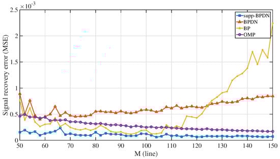 In the next simulation, reconstruction performances among supp-BPDN, BPDN, BP, and OMP algorithms were obtained for numbers of measurements M ranging from 50 to 150. Likewise, we set , , iterations to 100, and SNR to 15 dB. The results are demonstrated in Figure 3. Similarly, supp-BPDN performed the best in the whole range. The curve of supp-BPDN shows a little decrease as M increases; there are small fluctuations during the variation. Additionally, a stable period with a little rise is shown in the curve of BPDN.
