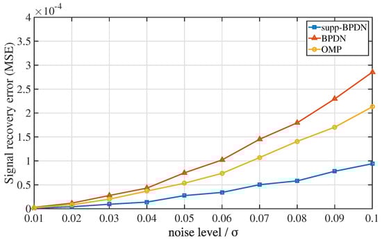 Similarly, we set , , and circulation times to 3000. For every noise level, we repeated these algorithms 100 times. Recovery results are shown in Figure 4. When the noise level is from 0.01 to 0.1, curves of BPDN and OMP possess a steeper slope; recovery error is more steady in supp-BPDN.