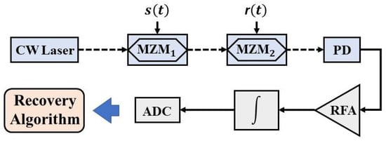 The layout of the proposed scheme is shown in Figure 5. Firstly, a continuous wave (CW) laser is used to generate continuous wave regarded as an optical carrier propagating in single mode fiber (SMF). Additionally, the light is modulated by the sparse-frequency radio frequency (RF) signal during the first MZM. After that, the optical signal carrying information enters the second MZM to be modulated another time. During this step, known PRBS patterns are encoded on the optical wave, yielding a multiplied signal whose RF signal is mixed with PRBS patterns to propagate into PD, transforming it into an electrical signal. Both MZMs are worked at the quadrature bias point. After PD and the amplifier, the signal is integrated during each period by the integrator. Finally, an ADC with a much lower sampling rate than the Nyquist frequency is applied to digitalize the measurements , and recovery algorithms are used to reconstruct signals.