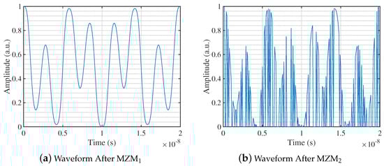 in which is the PRBS. Meanwhile, modulated waveforms of MZMs are shown in Figure 6, demonstrating a single period of signals in time domain. Figure 6a shows the original signal, and Figure 6b exhibits the original signal encoded by PRBS being measured.
