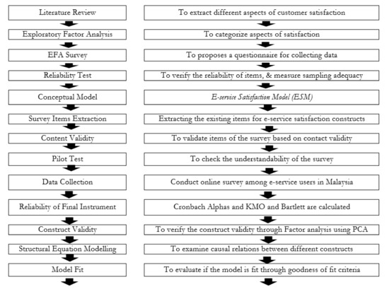 The research process that was followed in the development of a survey to evaluate the user satisfaction with e-commerce is summarized in Figure 1. As this figure shows, a comprehensive literature review was initially needed for the extraction of different aspects of customer satisfaction. Then, some dimensions of the affecting factors that are reduced through a conceptual model and exploratory factor analysis (EFA) were proposed. An online survey questionnaire was developed for data collection. Moreover, the validity of the measurement instruments and correlations among variables were assessed by calculating Cronbach’s alpha and Kaiser–Meyer–Olkin (KMO) indexes, respectively. Along with adapting some items from the ESM survey, a comprehensive literature review was then undertaken with the purpose to extract items that already exist as different constructs of satisfaction in e-commerce, too. In the next step, to carry out the content validity of the survey, 12 experts [32,33,34] were recognized based on their experience in the e-commerce field to determine important measures that should be included in the ultimate questionnaire and remove items below the level of a content validity ratio (CVR) of 0.05. Then, by conducting a pilot study on 35 students, the response rate, heterogeneity, and understandability [35] of the questions were examined. Next, e-commerce users in Malaysia were chosen for data collection purposes through surveys, and Cronbach’s alpha and KMO and Bartlett tests were carried out to measure reliability and sampling adequacy. Afterward, factor analysis was employed through PCA, aiming to evaluate discriminant and convergent validity (the construct validity). Structural equation modeling was then applied to carry out causal relations among different constructs and the credibility of the ESM model, and finally, the fit of the model was evaluated.