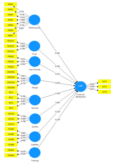 Based on the estimated path coefficients, customer satisfaction affects all aspects positively. The coefficients of training, performance, user-friendliness, trust, usability, security, quality, and design were all significant.