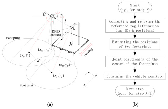Geometry of the dual-antenna RFID positioning system (a) and diagram of the proposed dual-antenna RFID positioning scheme (b).
