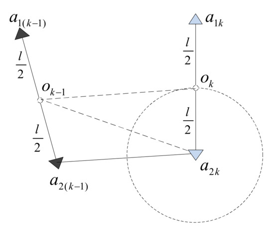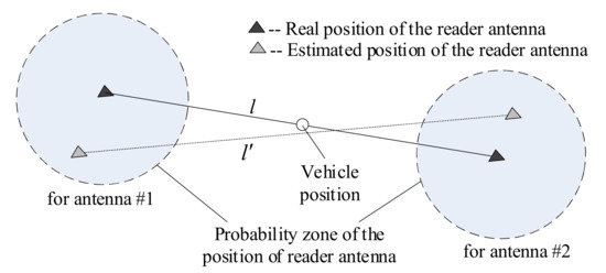 As shown in Figure 5, suppose at time step k, antenna #1 at position detects less than three tags so that antenna #1 cannot be positioned. While antenna #2 is at position detects more than three tags so that antenna #2 can be positioned. is the vehicle position at time k to be evaluated by the Monte Carlo algorithm. Since the position of antenna #2 is more reliable, joint positioning may use the position to correct the position of antenna #1.