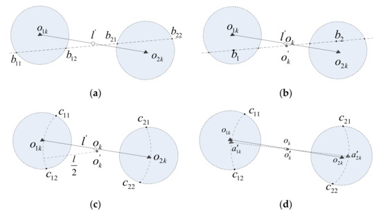 - Draw a circle of radius centered at , then two circular segments and can be founded in two potential footprint center areas, as shown in Figure 4c