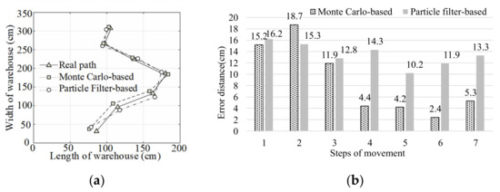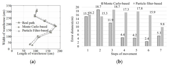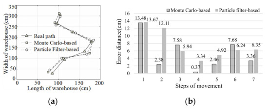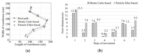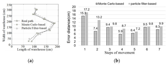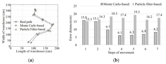 From Figure 12b, we may calculate the average positioning error. For the positioning with the particle filter-based algorithm in [28], it is 15.86 cm. The proposed Monte Carlo-based positioning algorithm yields higher accuracy in practice.