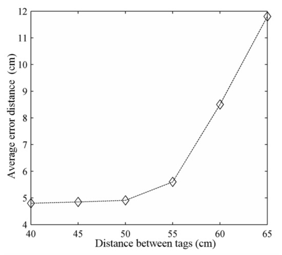 From Figure 14, it is observed that when the interval between two RFID tags on the floor is larger than 50 cm, the average positioning error increases drastically. The reason is that for a footprint of a radius of 90 cm, the number of tags detected by each antenna may not be sufficient. The sparser the reference tags on the floor, the larger the sampling area and the more the sampling particles.
