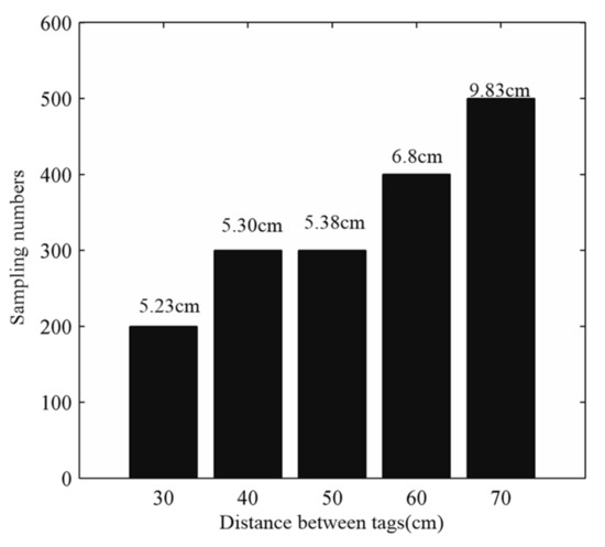 From Figure 15, we have the observation that a too-dense tag distribution on the floor is not necessary because we do not find significant improvement in positioning accuracy. For a sparse tag distribution on the floor, increasing the sampling number may benefit the positioning accuracy. However, the tag density gives a decisive effect.