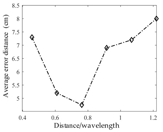 From Figure 17, it is found that there is an optimal distance between the two antennas. For the experiment system operating in the lab, as shown in Figure 9, it is around the 0.76 wavelength.