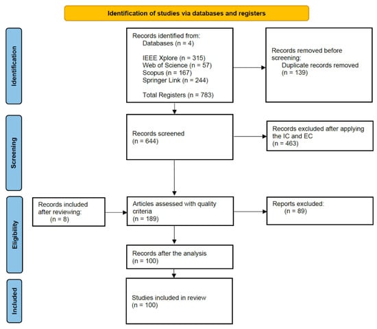 - The results after querying the selected databases (identification phase) report the following results: 783 papers collected: 57 (7.28%) from Web of Science, 167 (21.33%) from SCOPUS, 315 (40.23%) from IEEE Xplore and 244 from Springer Link. After removing 139 duplicates (17.75%) the total results of unique registers are 644 (82.25%). All these results are included in a Google Sheets [] and the BibTeX files are included in a git repository [].