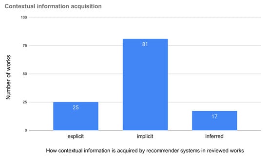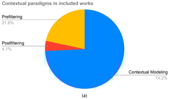 Furthermore, the rise of mobile technologies and ubiquitous computing employing Internet of Things (IoT) devices has allowed these systems to include information about the user’s context when making their personalized recommendations. These types of recommender system are called context-aware recommender systems (CARS) [] that seek to improve the relevance of the recommendations provided to the user by taking advantage of contextual information such as the user’s location, time of day, physical activity, emotional state and other aspects of their environment. These contextual characteristics may influence the rating that the user would give an item depending on the specific situation in which the user is expecting the recommendation, and this issue has been extensively studied and confirmed in the scientific community [] and by companies such as Netflix [].