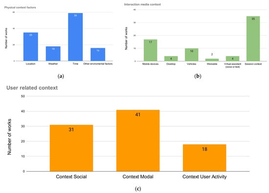 In previous reviews of the state of the art such as [,,] or articles such as [] oriented to CARS in a non-specific domain, different categories of context are identified at a more general level: individual context of the user, time, activity carried out by the user and relational context. In the chapter of the book [] dedicated to music recommender systems the context in the music domain is classified into two major groups: environment-related context and user-related context. In this paper we have taken the two main categories above and added further sub-categories of context in this domain as follows: