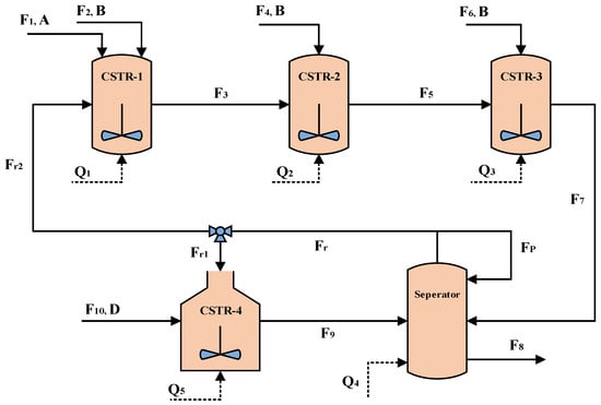 Alkylation of benzene with ethylene, a principal process in the petrochemical industry, produces ethylbenzene, which is widely used as a large-scale benchmark. As shown in Figure 3, the process studied in this work consists of four continuously stirred tank reactors (CSTRs) and a flash tank separator. A detailed description of the process is described in [32,33]. The process’s manipulated variables are heat inputs to five vessels shown by Q1, Q2, Q3, Q4, and Q5. The temperatures of five vessels T1, T2, T3, T4, and T5 are considered the process’s outputs. The process’s dynamic behavior is set out in detail in Equations (41)–(45), and all parameters are named in Table 1. For more information and the value of fixed parameters, refer to [34].