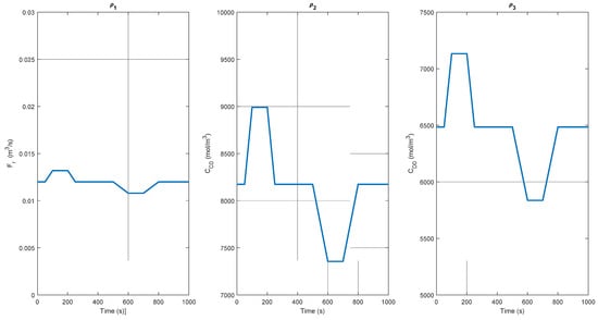Looking firstly at reference tracking, the proposed controller’s rise time is slightly larger than other methods, while being fast enough. On the other hand, the proposed controller has a lower settling time. In contrast to LPV-MPCs that reach the reference, the linear RMPC has a non-zero steady-state error, especially in and . The proposed controller reached the setpoint without any oscillations, while linear RMPC and LPV-RMPC suffer from large-amplitude oscillations. The reason behind the fluctuation in for linear RMPC can be found in Equation (35), such that directly affects the output, and LRMPC failed to tackle the changes in molar densities of pure D. In general, regardless of rise time, settling time, and overshoot, all three methods followed the setpoints for to .