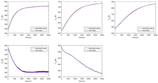 Temperatures in five vessels: blue and red lines indicate the measured outputs and simulated outputs from the LPV model, respectively.