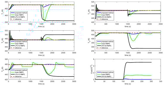 The temperatures of vessels and cost function using three studied methods (dashed red line: references, the blue line: proposed method, the green line: linear RMPC, the black line: LPV-IO RMPC).