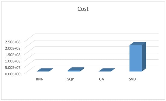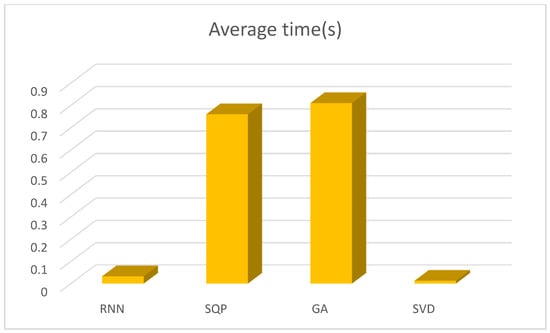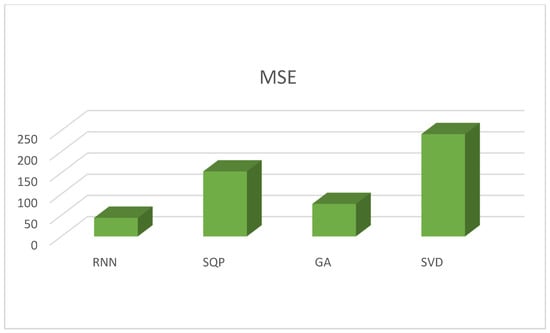 After evaluating the performance of the proposed controller, the importance of RNN needs to be emphasized. Finding the global minimum in a shorter time was the primary reason behind using RNN in this study. To this end, RNN is compared with three widely used optimization algorithms for MPCs, namely, sequential quadratic programming (SQP), genetic algorithm (GA), and singular value decomposition (SVD). It has been proven that using RNN reduces the average time required for computing the control action in each sampling in contrast with NMPC based on SQP, GA, and SVD. The average run-time and MSE of these methods is reported in Table 4 and Figure 7, Figure 8 and Figure 9. The RNN-based method experienced far less MSE (43.84) and cost () than other optimization algorithms and found the optimal control actions remarkably quick (0.033). GA ranked second in cost and MSE, while being slow, resulting in instability and significant fluctuations in some simulations. In stark contrast, however, SVD has faster responses, although it failed to converge the minimum cost function at times and saw monumental errors. SQP, on the other side, had a smaller MSE and cost than SVD and solved the optimization problem in a shorter time than GA did. According to Figure 7, RNN and SVD have the lowest and highest MSE, respectively. Figure 8 depicts that SQP and GA are sluggish as opposed to RNN and SVD. As described in Figure 9, SVD is the only method with a significant error and fails to find the proper control actions from the optimization problem.