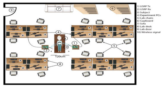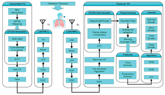 The data is collected in a real-time lab environment as shown in Figure 4. The experimental setup used two desktop PC and two USRP devices equipped with two Omni-directional antennas. The distance between the two antennas is 120 cm. The breathing experiments are conducted in a quiet environment without any humans in the lab except the person performing the experiments. The developed platform is very sensitive to human movements so it was necessary to conduct experiments in a quiet environment. The desktop PC used on the transmitter side is a Lenovo Intel(R) Core (TM) i5-7400 3.00 GHz processor, 8 GB RAM with the Windows 10 64-bit operating system. The desktop PC on the receiver side is a Lenovo Intel(R) Core (TM) i5-7500 3.40 GHz processor, 16 GB RAM with Windows 10 64-bit operating system. Two B210 USRP devices are used and their hardware configuration parameters are provided in Table 2. Five healthy subjects are selected and trained by using video demonstration for performing the experiments. The details of the subjects for performing the experiments are provided in Table 3. The breath patterns used to conduct experiments are normal breath (Eupnoea), slow breath (Bradypnea), fast breath (Tachypnea), and deep breath (Kussmaul). Normal breath experiments are conducted when the subject breathes at a normal rate. The “normal” rate depends on age but a typical adult takes between 12 and 20 breathe per minute when resting. Slow breath experiments are conducted when the subject breathes slower than what is considered normal. This means that the body is not getting sufficient oxygen. The slow breath may be a symptom of a condition that affects metabolism or another problem, such as carbon monoxide poisoning, drug overdose, or sleep apnea. Fast breath experiment is the opposite of slow breathing. In this case, the subject breathes faster than normal. It can be a symptom of lung illness that limits the intake of air. Deep breath experiments are conducted when humans breathe deep and fast. This type of breathing occurs in humans having problems related to diabetes. Due to diabetes, the body does not use appropriate sugar for energy, instead, it burns stored fat in place of energy. This causes a rise in the acid level in the blood, which causes the human body to get rid of extra carbon dioxide by breathing deep and fast [42].