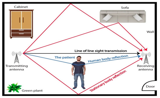 The wireless channel is modelled for the simulated and real-time wireless channel. The simulated channel includes ideal, AWGN, fading, and time-frequency dispersive channels to analyze the wireless channel characteristics and their effects on CFR. Wireless channel has rich information regarding the characteristics of the channel noise, Doppler shift, multipath fading, reflection, and diffraction as shown in Figure 2. Therefore, human body reflection information may be used for human health monitoring.
