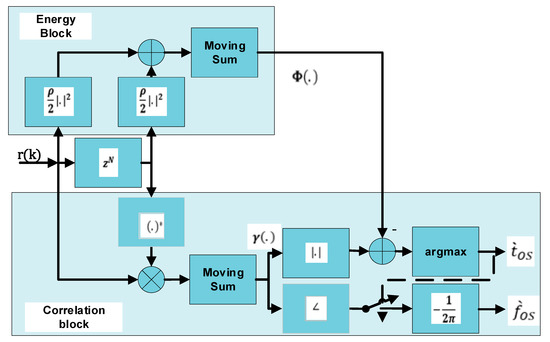 where provided in Equation (13) is used to estimates time offset and frequency offset The magnitude of is compensated by energy term and peaks at time instant which provides , while its phase at this time instant is proportional to . The is the correlation between two pairs of samples of OFDM frame that are samples apart. is the energy part and is the magnitude of the correlation coefficient provided in Equations (15)–(17), respectively.